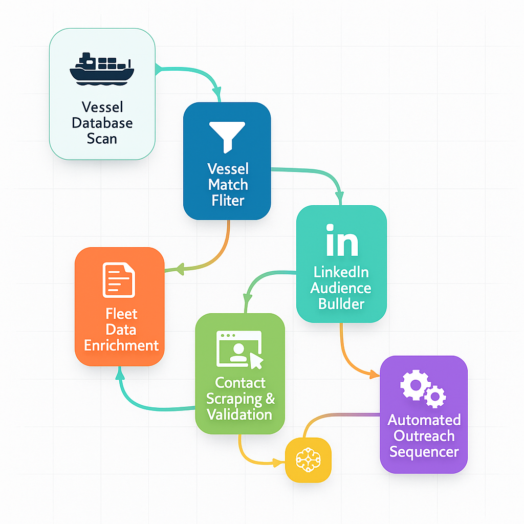 Depiction of VALO's fully automated AI outreach engine — from vessel matching to inbox-ready messaging. Every step in this flow was built to scale high-conversion prospecting without manual effort, generating $45M+ in pipeline in just 90 days.